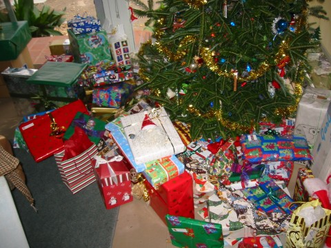 The tree with many presents on Christmas Eve day.